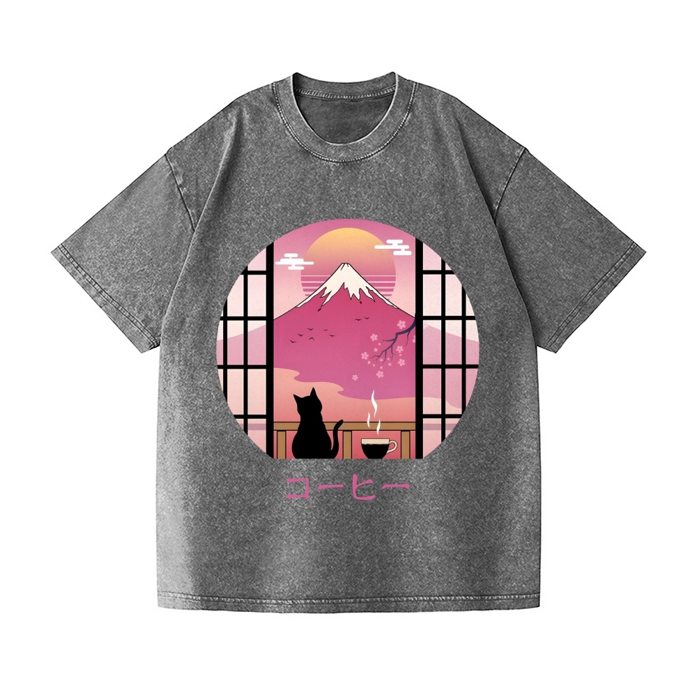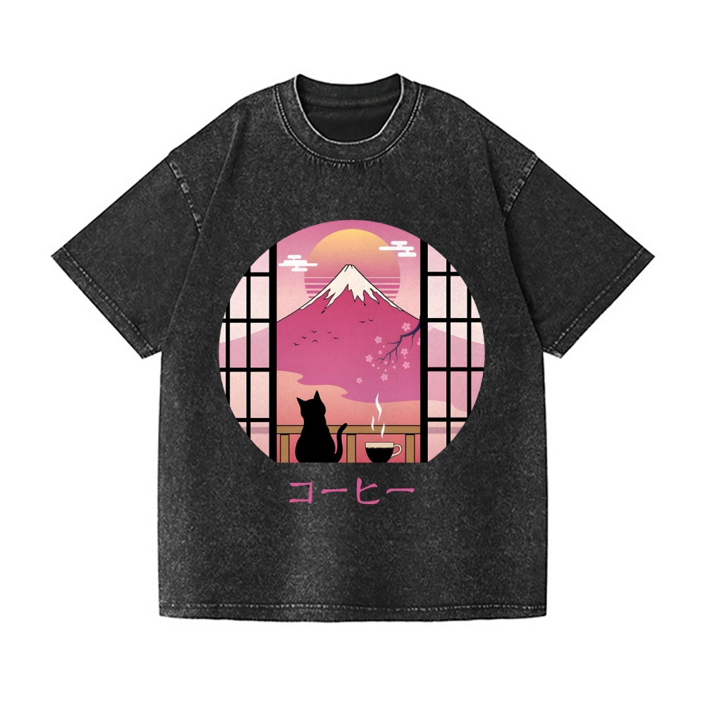 Sakura Fuji Cat Vintage Wash Japanese Design T-Shirt