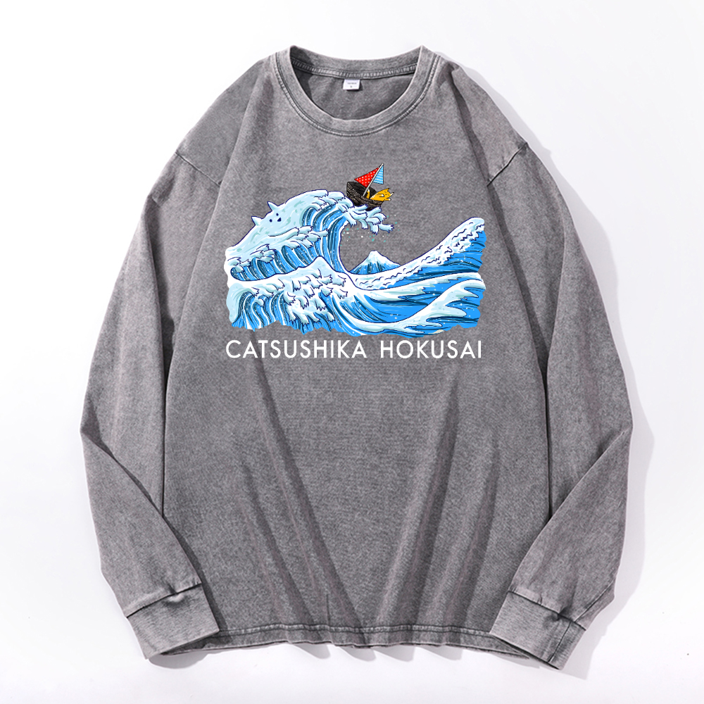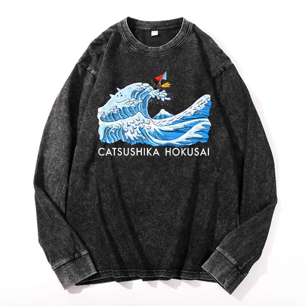Cat Wave Vintage Cotton Wash Crewneck Long-Sleeve T-Shirt