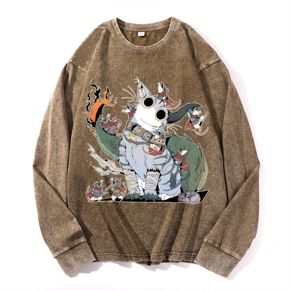 Cat Drake And Rat Knights Vintage Cotton Wash Crewneck Long-Sleeve T-Shirt