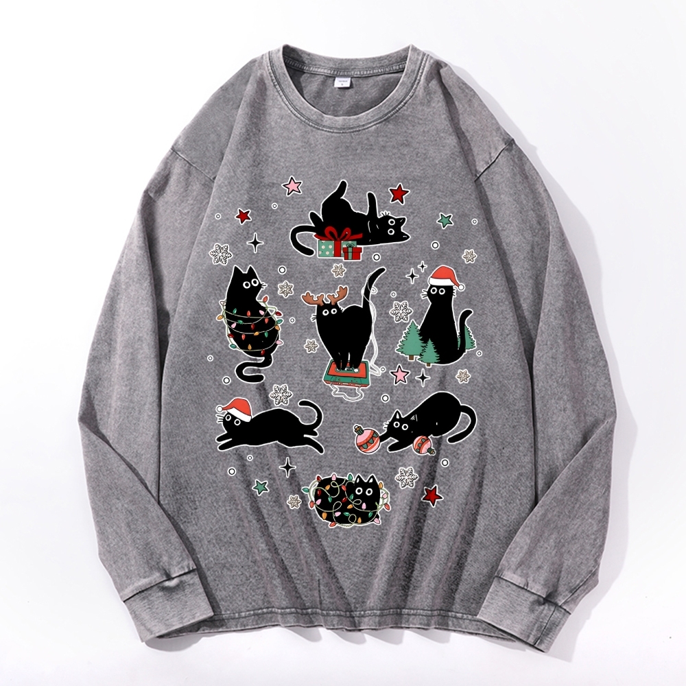 Christmas Cat Vintage Cotton Wash Crewneck Long-Sleeve T-Shirt