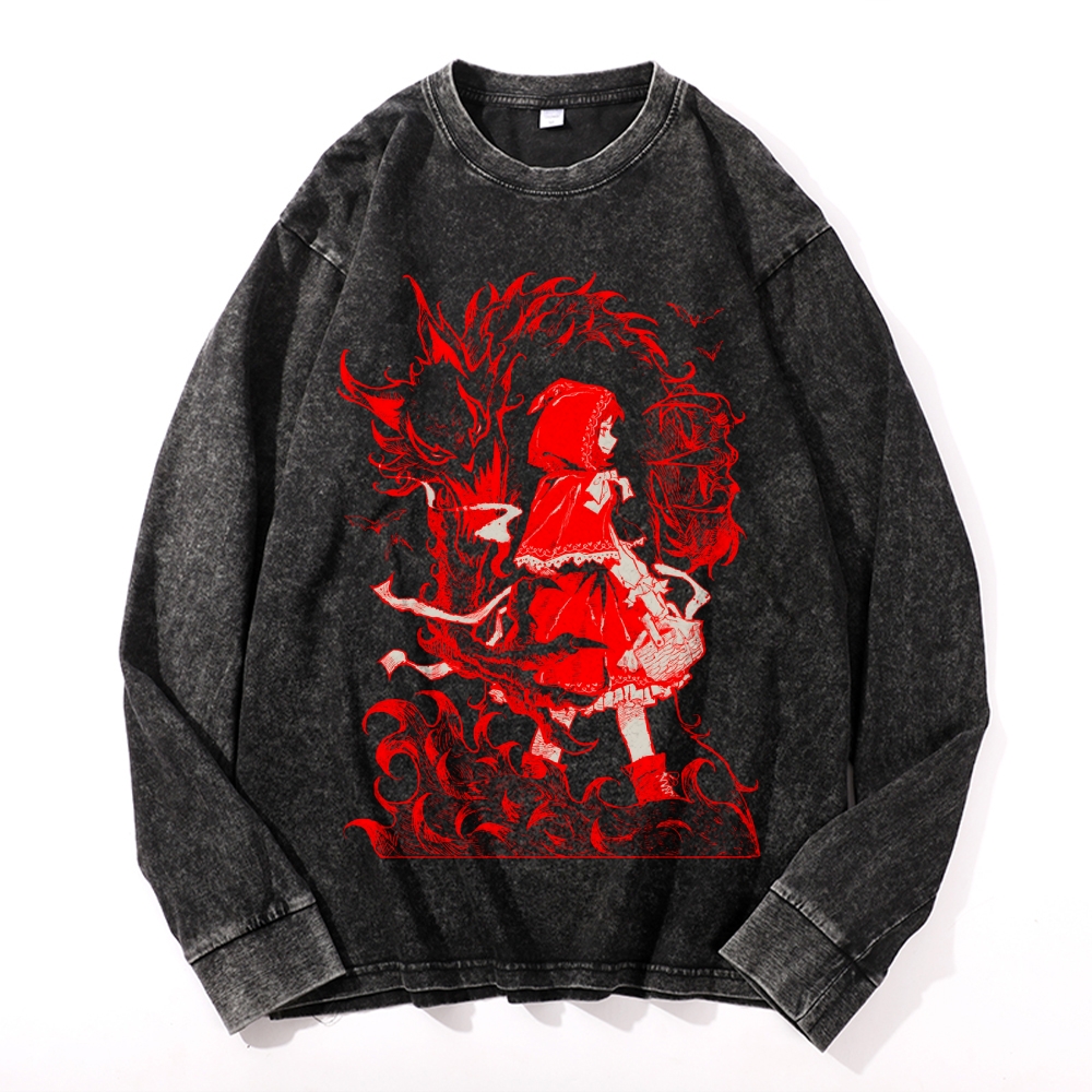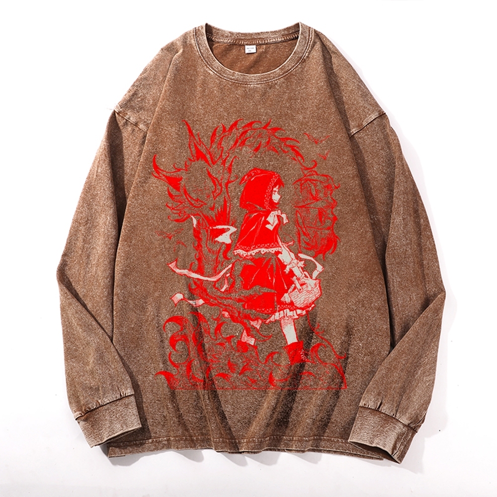 Flame Little Red Riding Hood Vintage Cotton Wash Crewneck Long-Sleeve T-Shirt