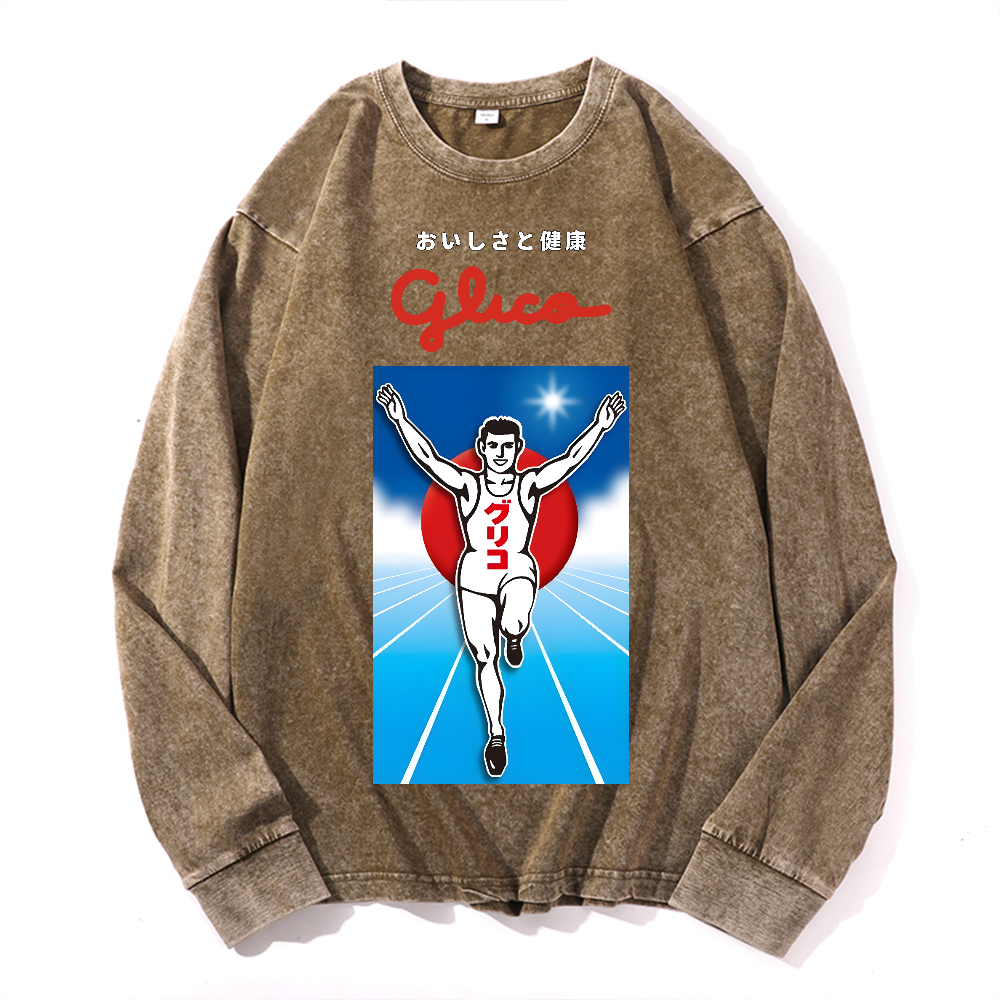 Osaka Dotonbori Glico Running Man Vintage Cotton Wash Crewneck Long-Sleeve T-Shirt