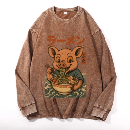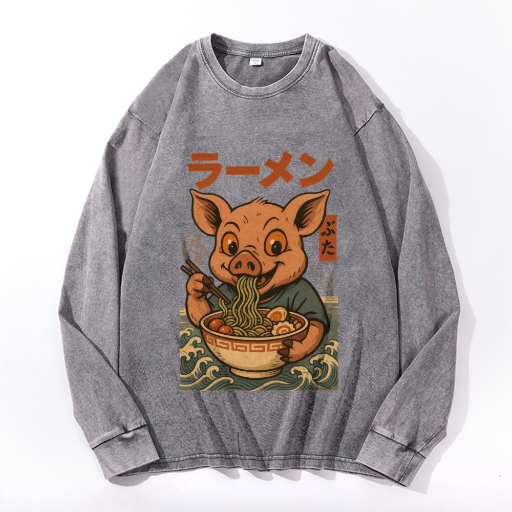 Ramen Pig Vintage Cotton Wash Crewneck Long-Sleeve T-Shirt