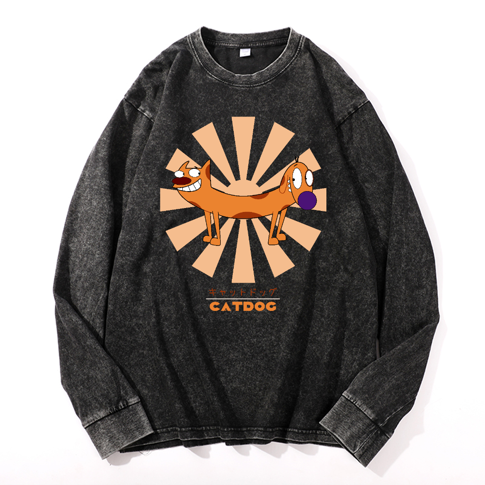 Catdog Vintage Cotton Wash Crewneck Long-Sleeve T-Shirt