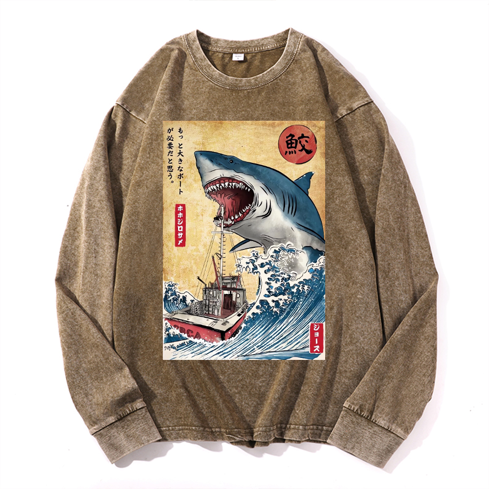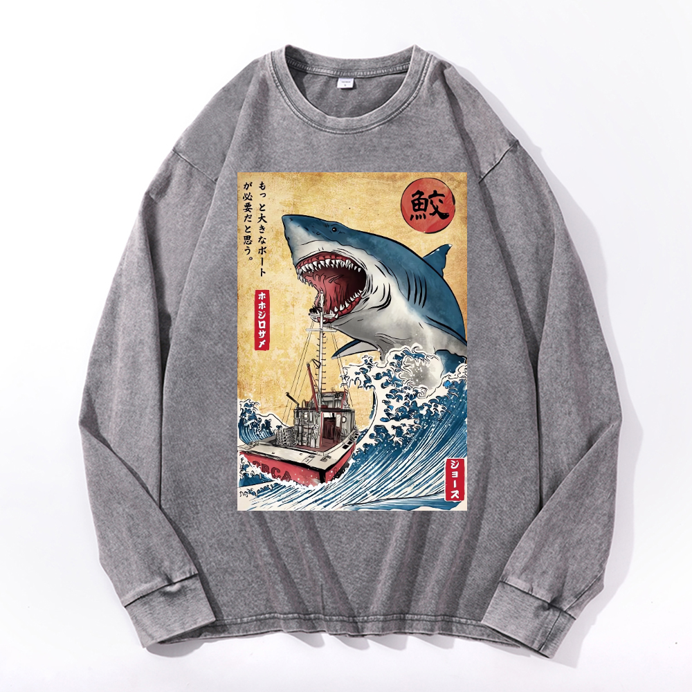 Shark Ukiyoe Vintage Cotton Wash Crewneck Long-Sleeve T-Shirt