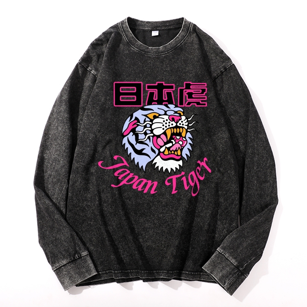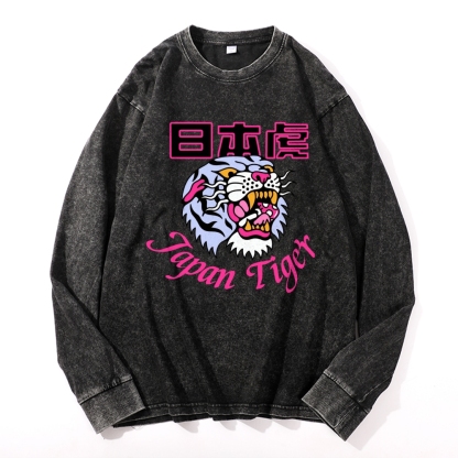 Japan Tiger Vintage Cotton Wash Crewneck Long-Sleeve T-Shirt