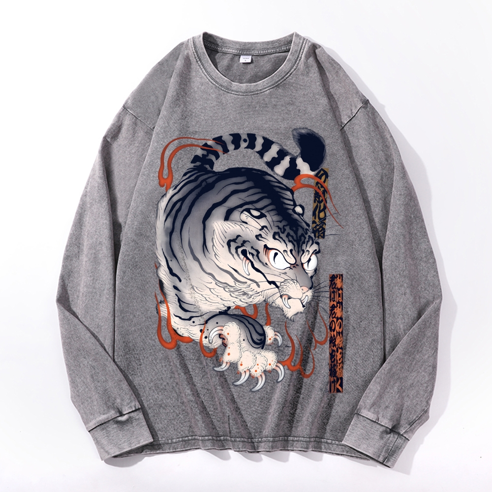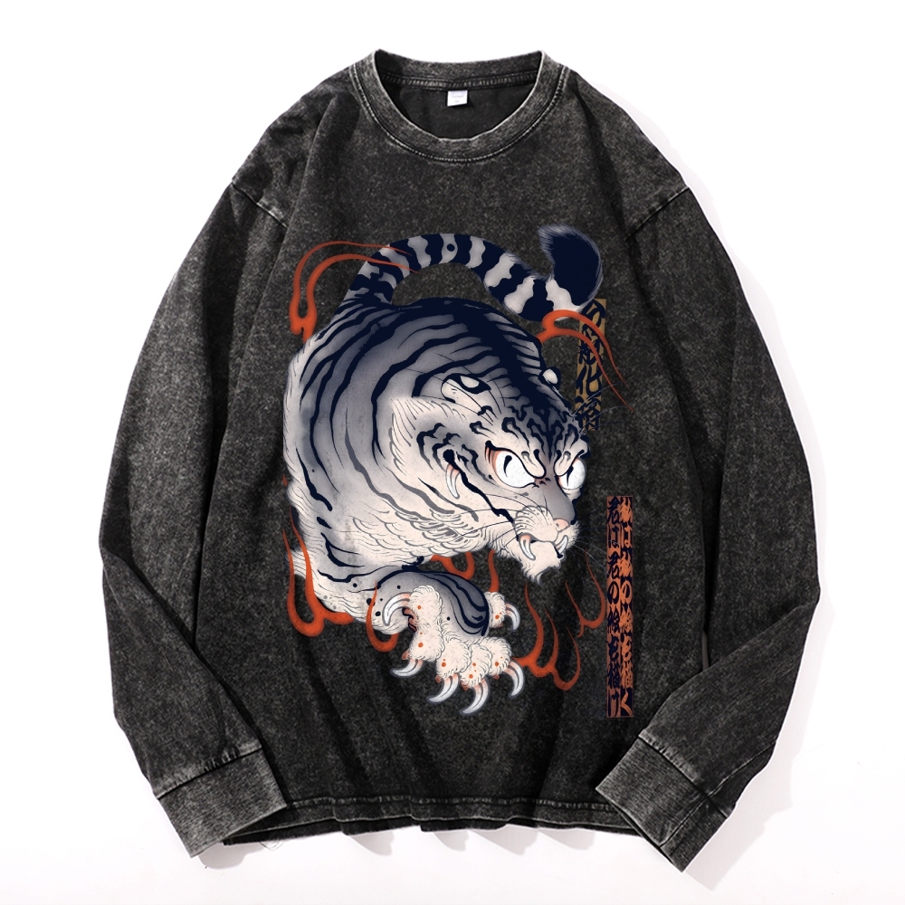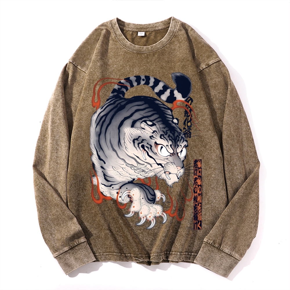 Japanese Tiger Vintage Cotton Wash Crewneck Long-Sleeve T-Shirt