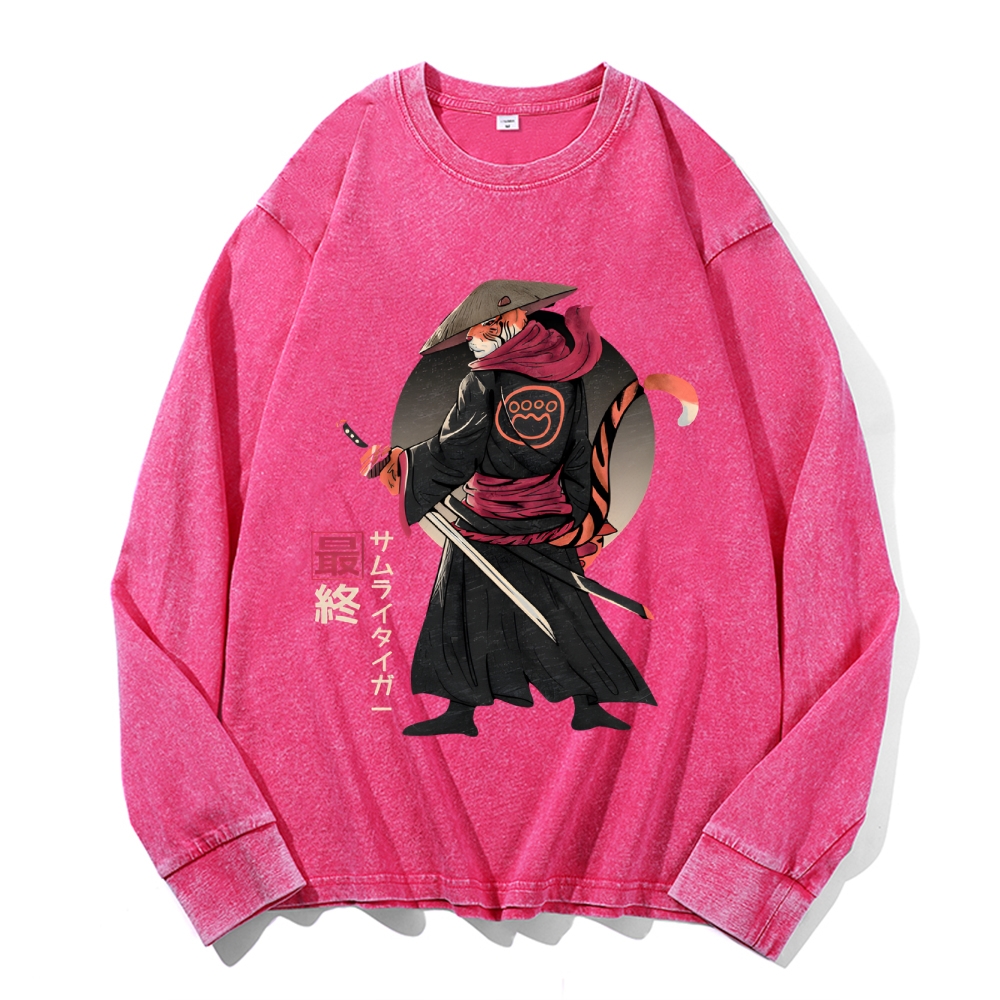 Tiger Samurai Vintage Cotton Wash Crewneck Long-Sleeve T-Shirt