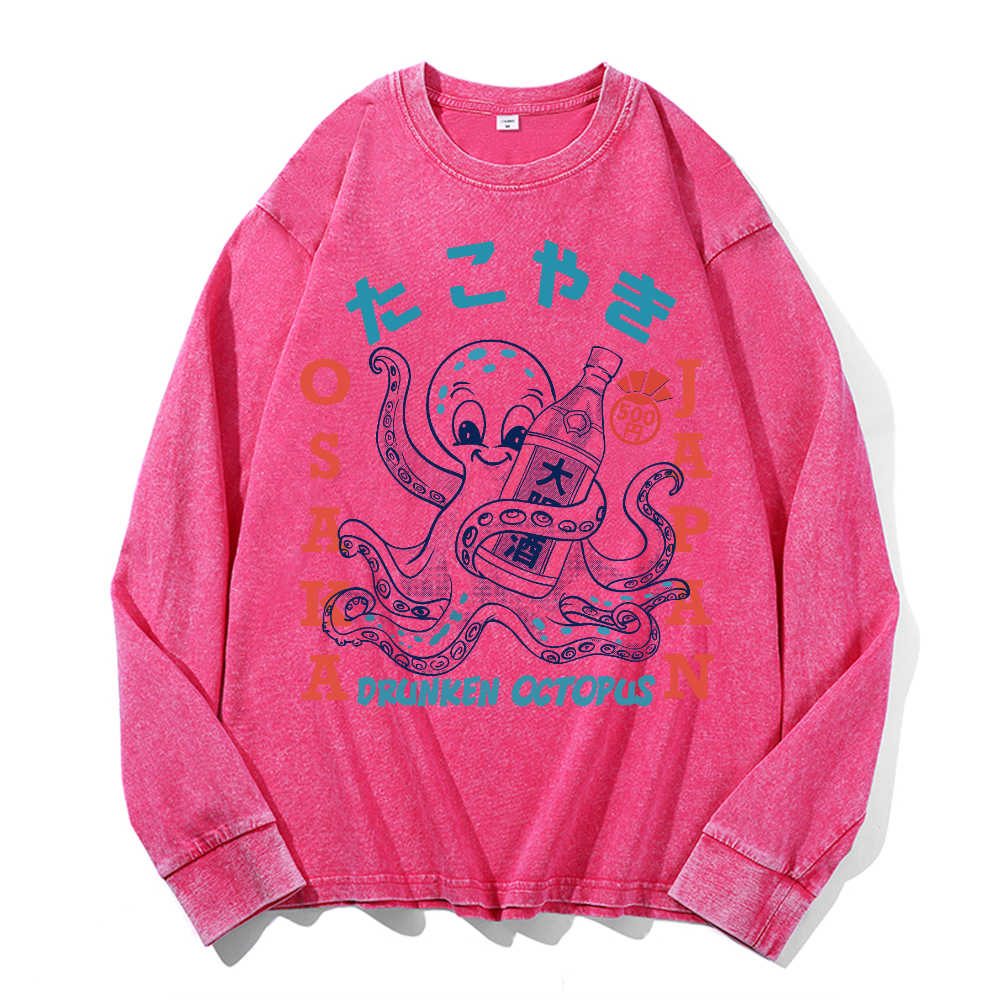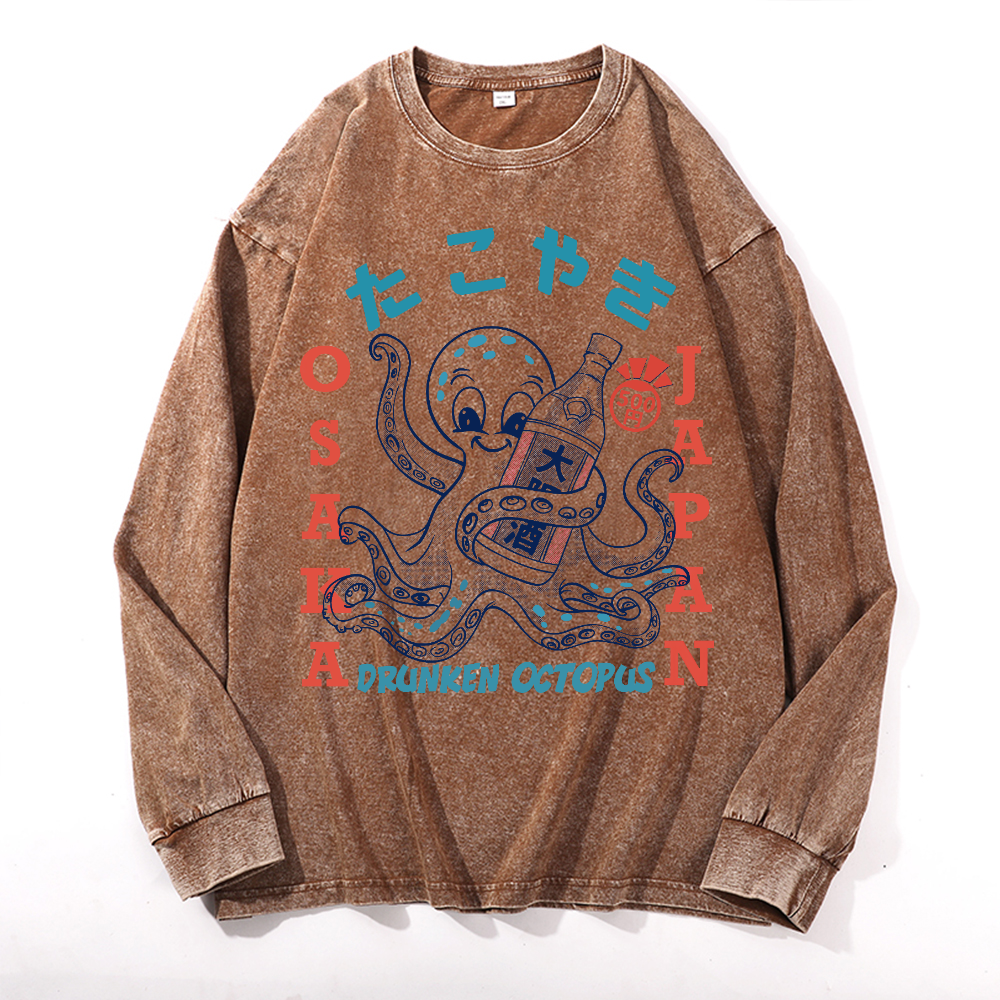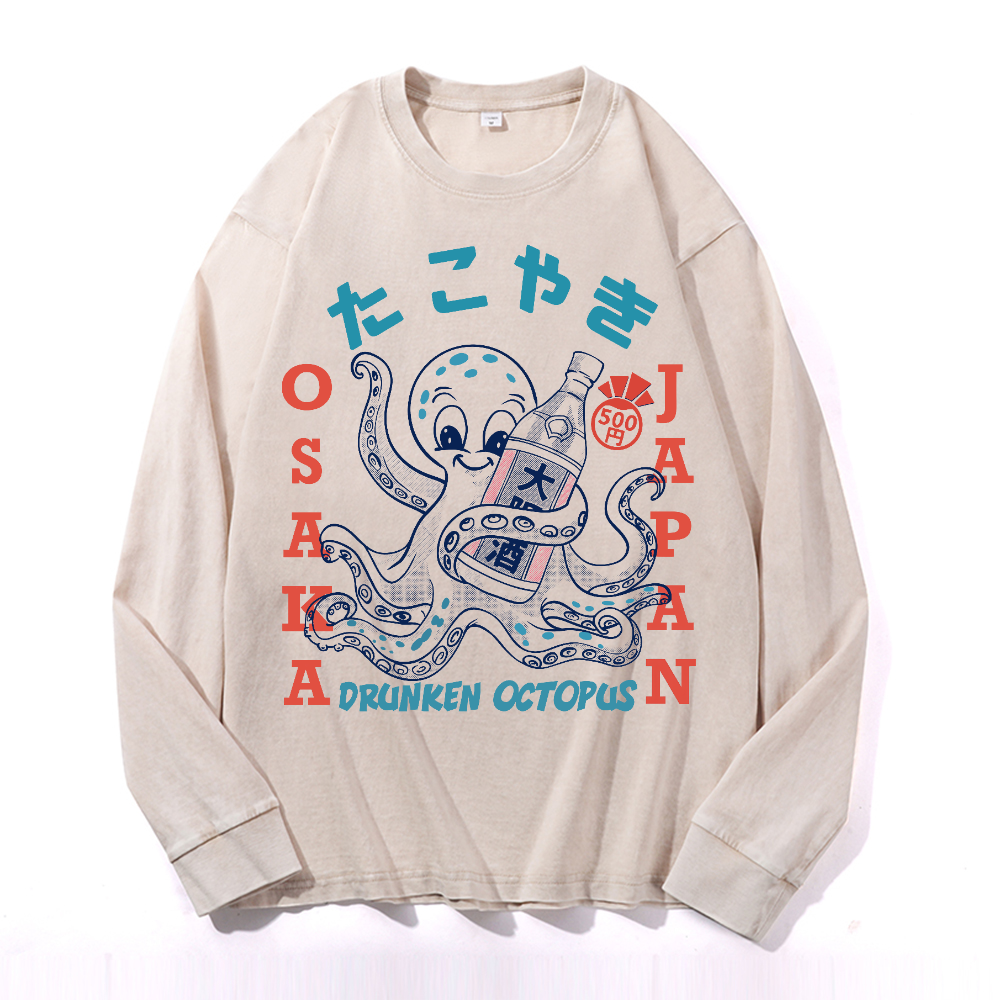 Drunken Octopus Vintage Cotton Wash Crewneck Long-Sleeve T-Shirt