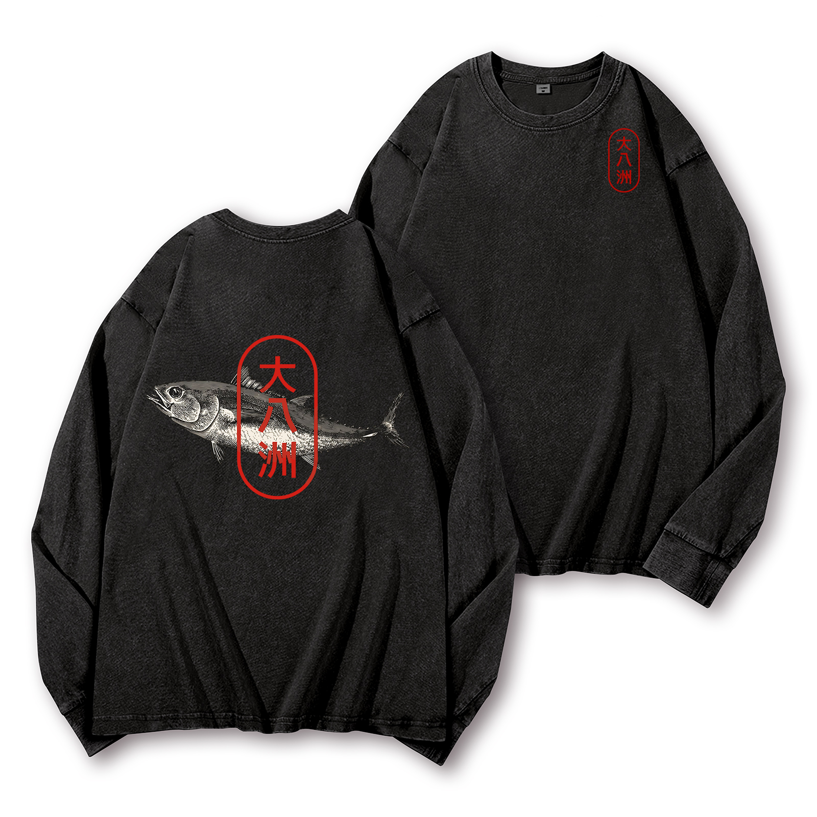 Great Eight Islands of Japan Tuna Fish Vintage Washed Cotton Back Art Long-sleeve T-shirt