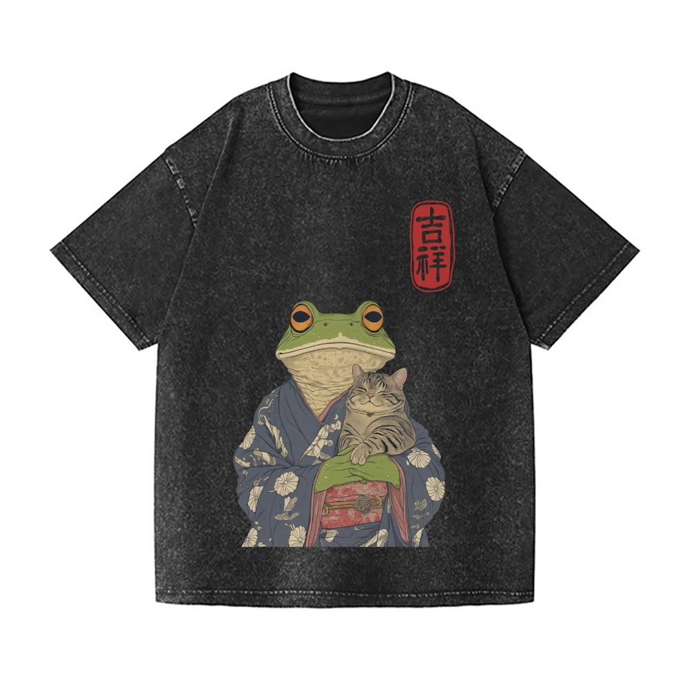 Frog Cat Vintage Wash Japanese Design T-Shirt