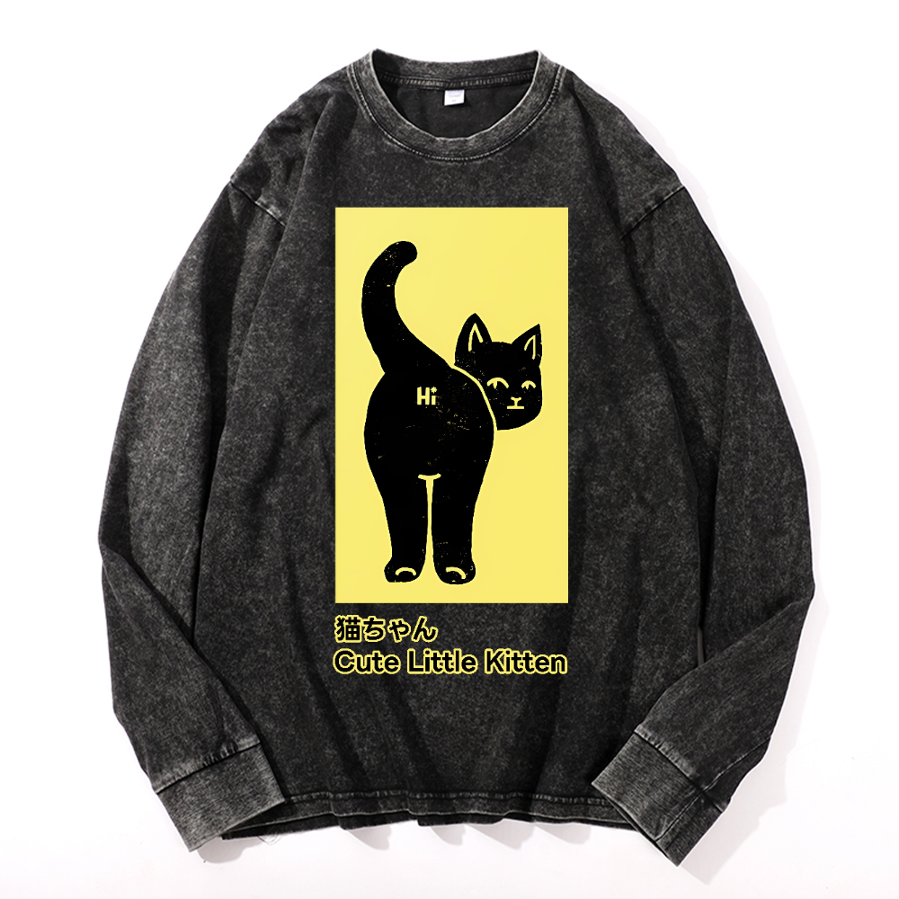 Cute Little Kitten Black Cat Vintage Cotton Wash Crewneck Long-Sleeve T-Shirt