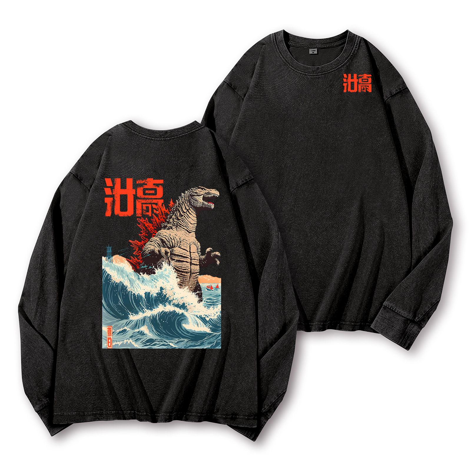 Kaiju Wave Vintage Washed Cotton Back Art Long-sleeve T-shirt