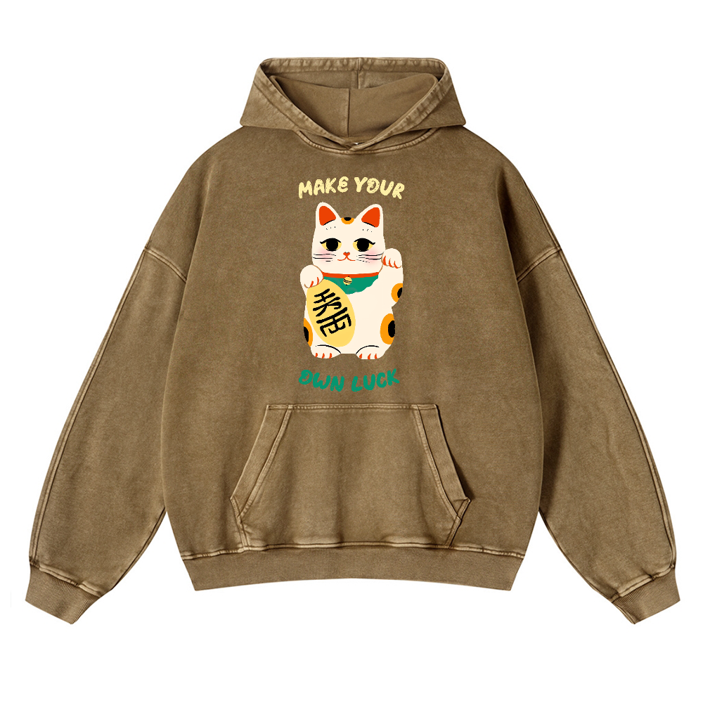 Lucky Cat Vintage Washed Thick Cotton Hoodie
