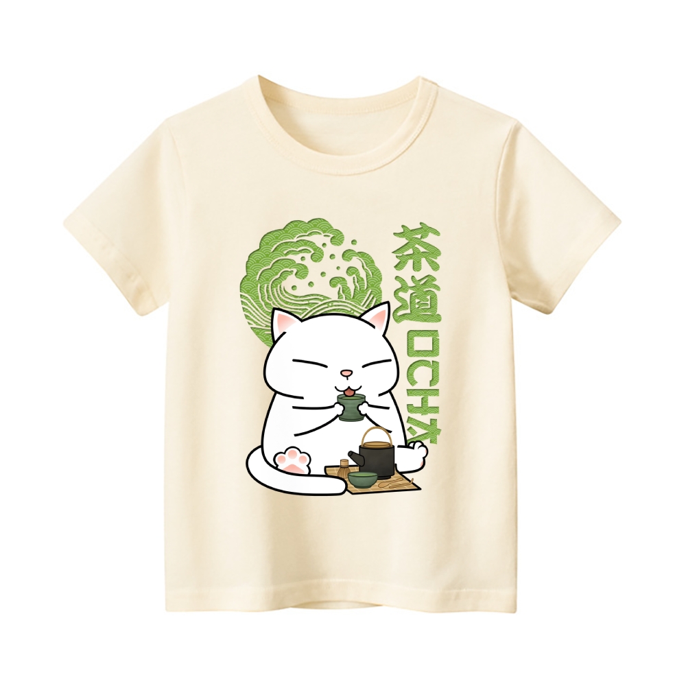 Green Tea Cat Vintage Kids Cotton T-shirt