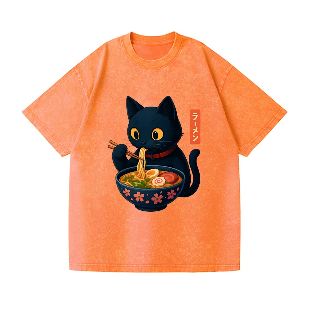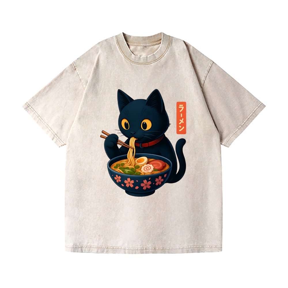 Black Cat Ramen Vintage Wash Japanese Design T-Shirt