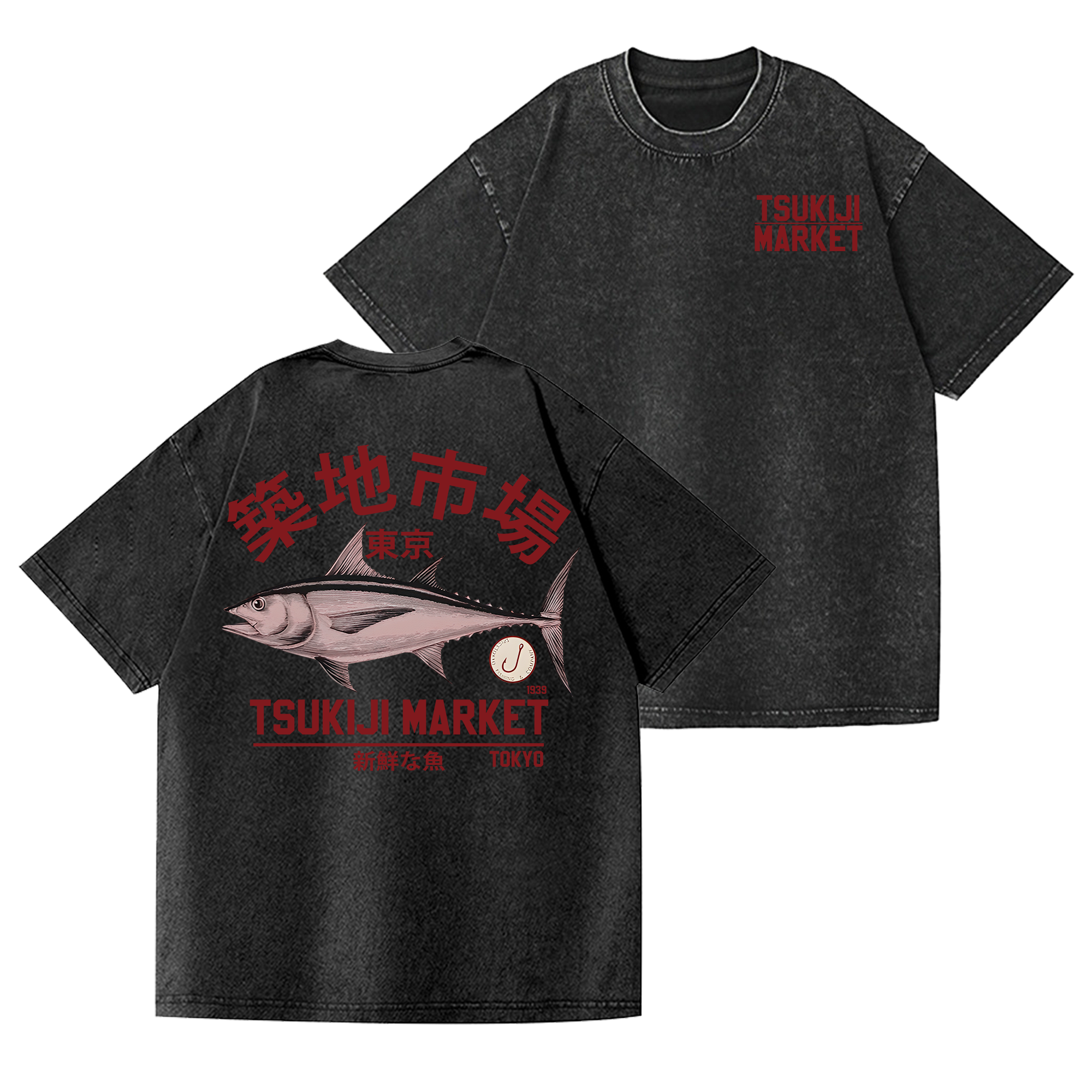 Tsukiji Fish Market Vintage Wash Japanese Design Back Art T-Shirt