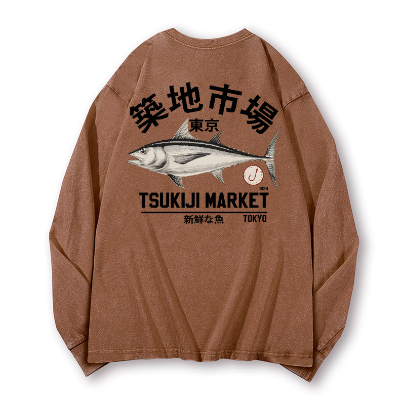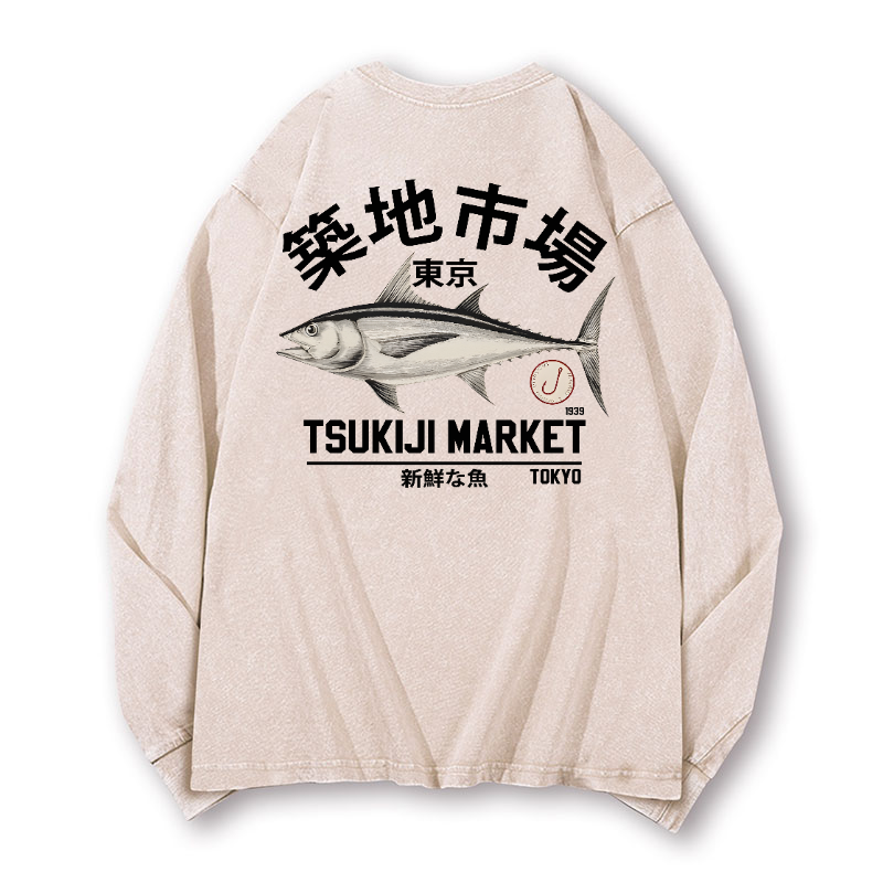 Tsukiji Fish Market Vintage Washed Cotton Back Art Long-sleeve T-shirt