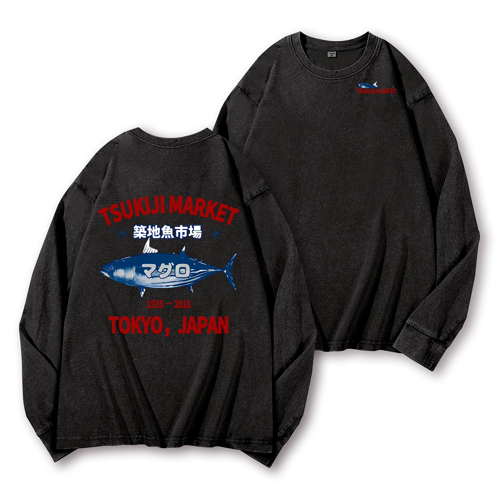 Tsukiji Market Tuna Fish Tokyo Japan Vintage Washed Cotton Back Art Long-sleeve T-shirt