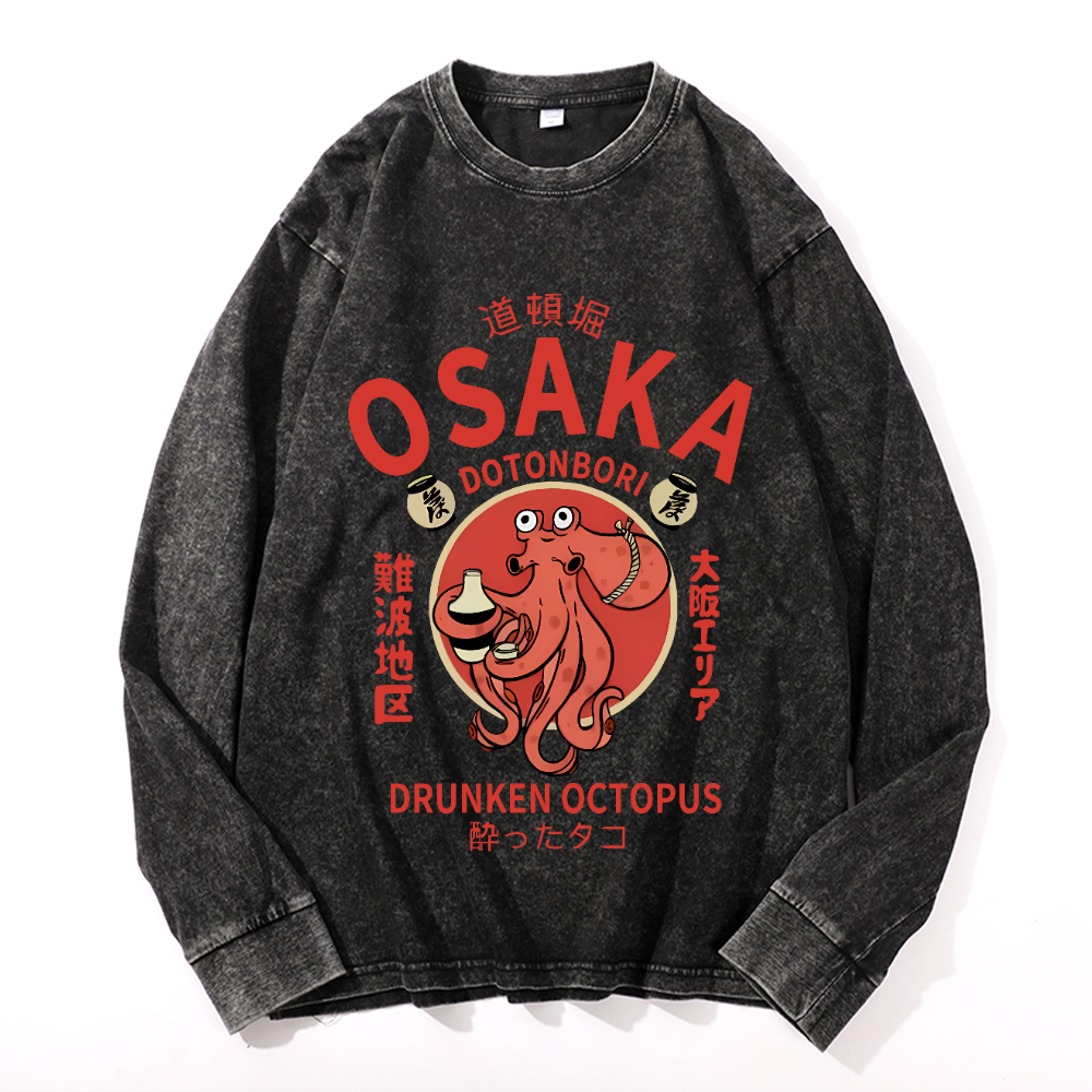 Osaka Dotonbori Drunken Octopus Vintage Cotton Wash Crewneck Long-Sleeve T-Shirt
