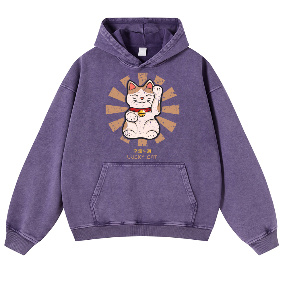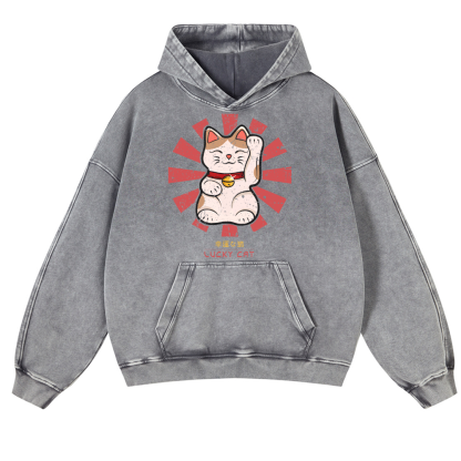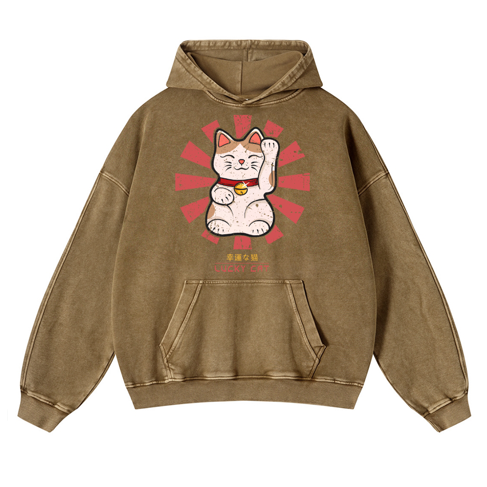 Lucky Cat Vintage Washed Thick Cotton Hoodie