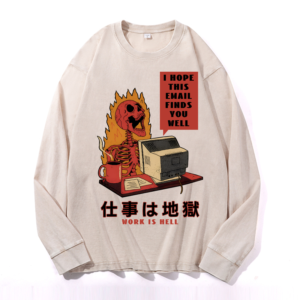 Skull Work Is Hell Vintage Cotton Wash Long-sleeve T-shirt