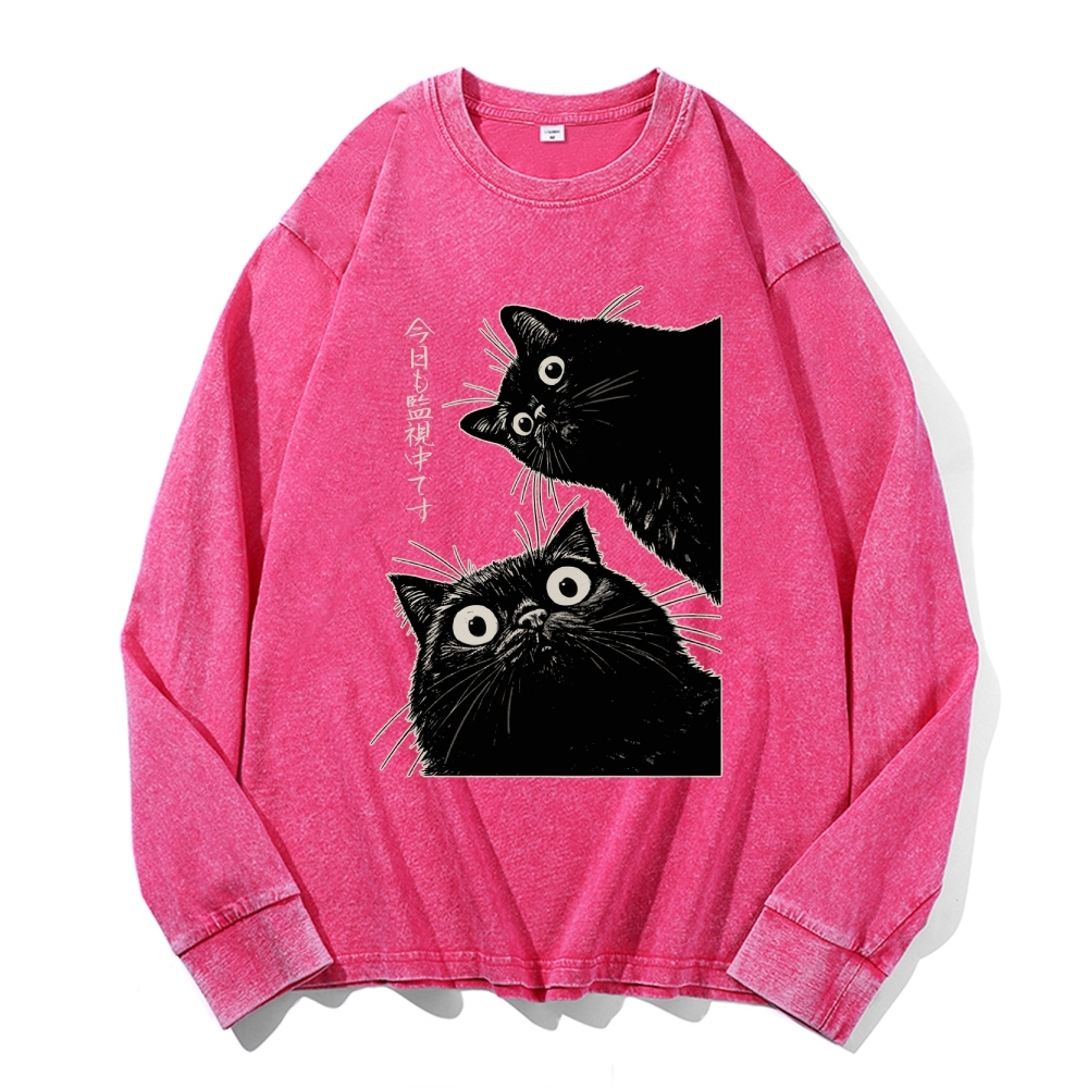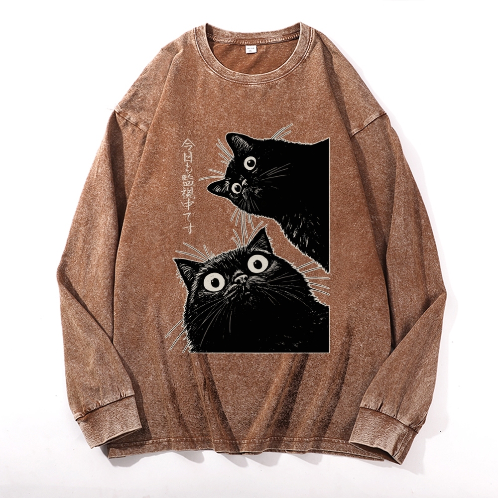 The Cat is Watching Today Vintage Cotton Wash Crewneck Long-Sleeve T-Shirt