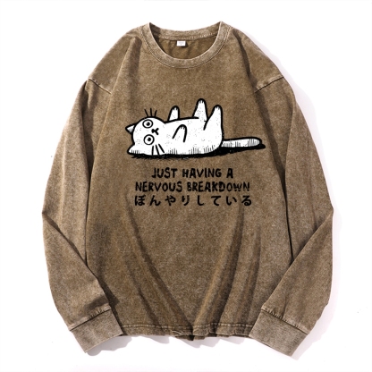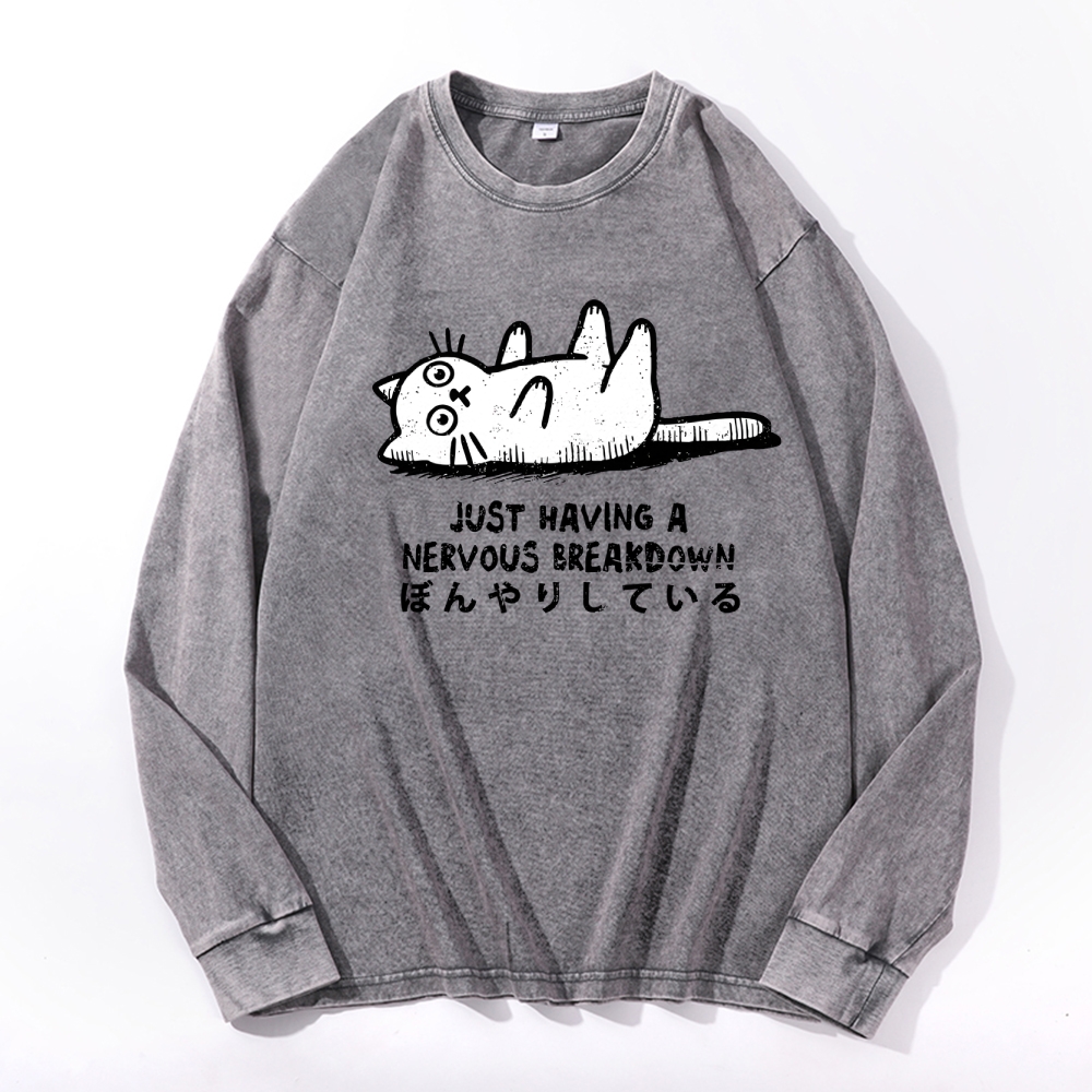 Nervous Breakdown Cat Vintage Cotton Wash Crewneck Long-Sleeve T-Shirt