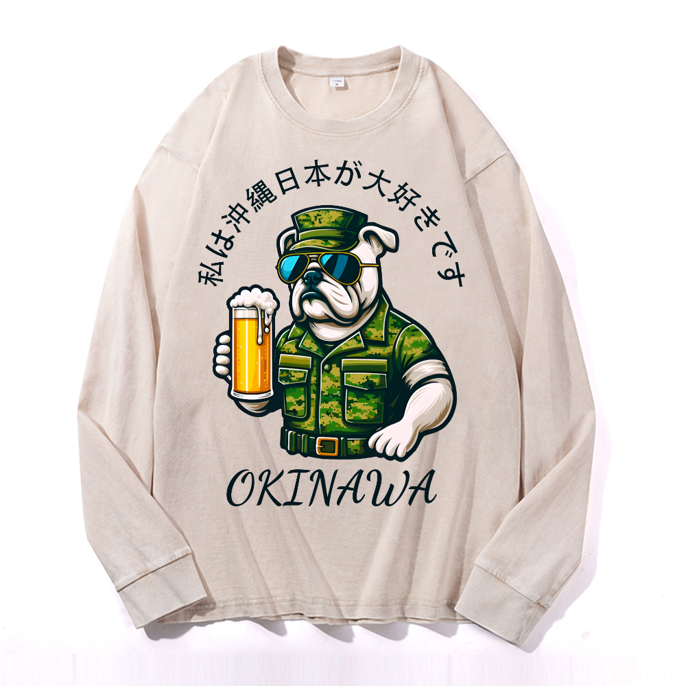 Okinawa Dog Vintage Cotton Wash Crewneck Long-Sleeve T-Shirt