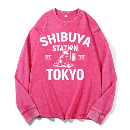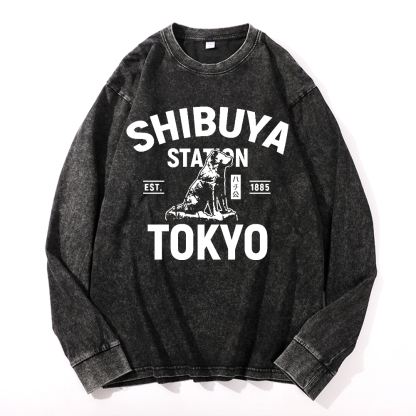 Shibuya Hachiko Vintage Cotton Wash Crewneck Long-Sleeve T-Shirt