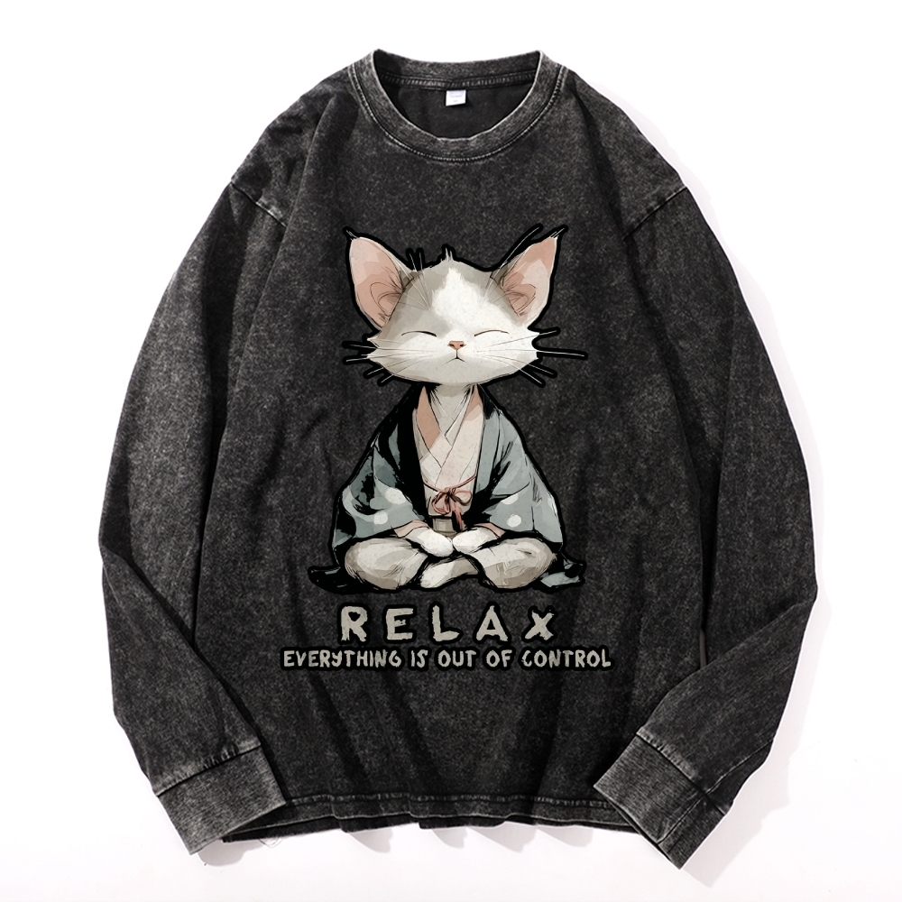 Zen Cat Relaxation,Everything's Out Of Control Vintage Cotton Wash Crewneck Long-Sleeve T-Shirt
