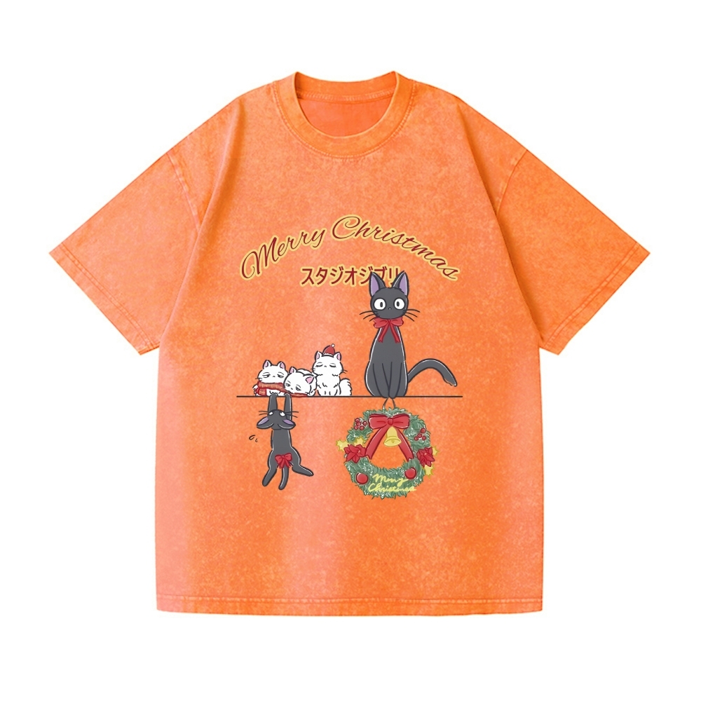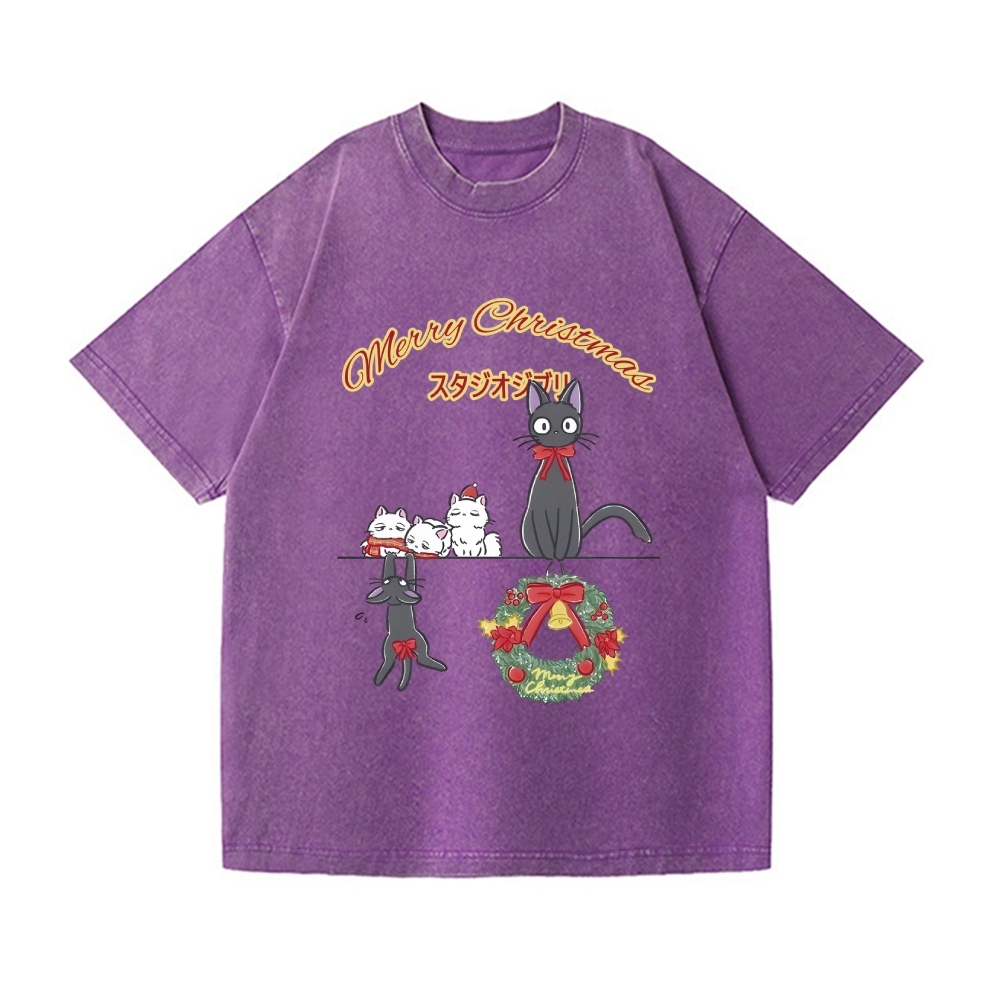 Ghibli Cat Merry Christmas Tree Vintage Wash Japanese Design T-Shirt