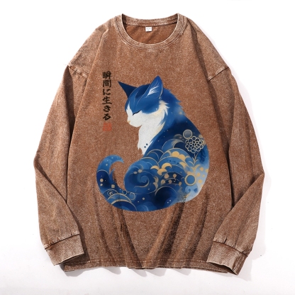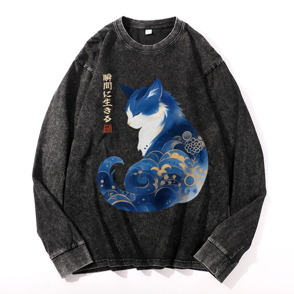 Retro Zen Cat: Living the Present Vintage Cotton Wash Crewneck Long-Sleeve T-Shirt