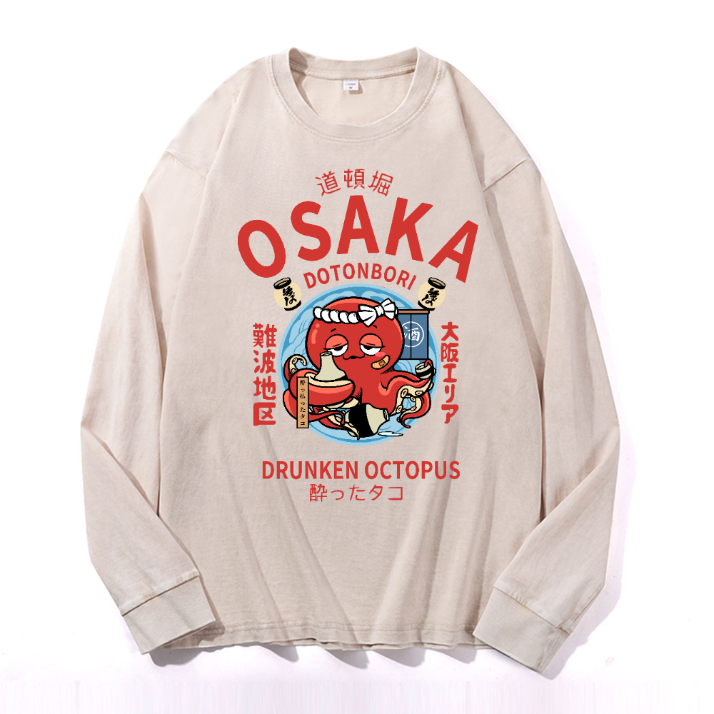Osaka Dotonbori Drunken Octopus Vintage Cotton Wash Crewneck Long-Sleeve T-Shirt
